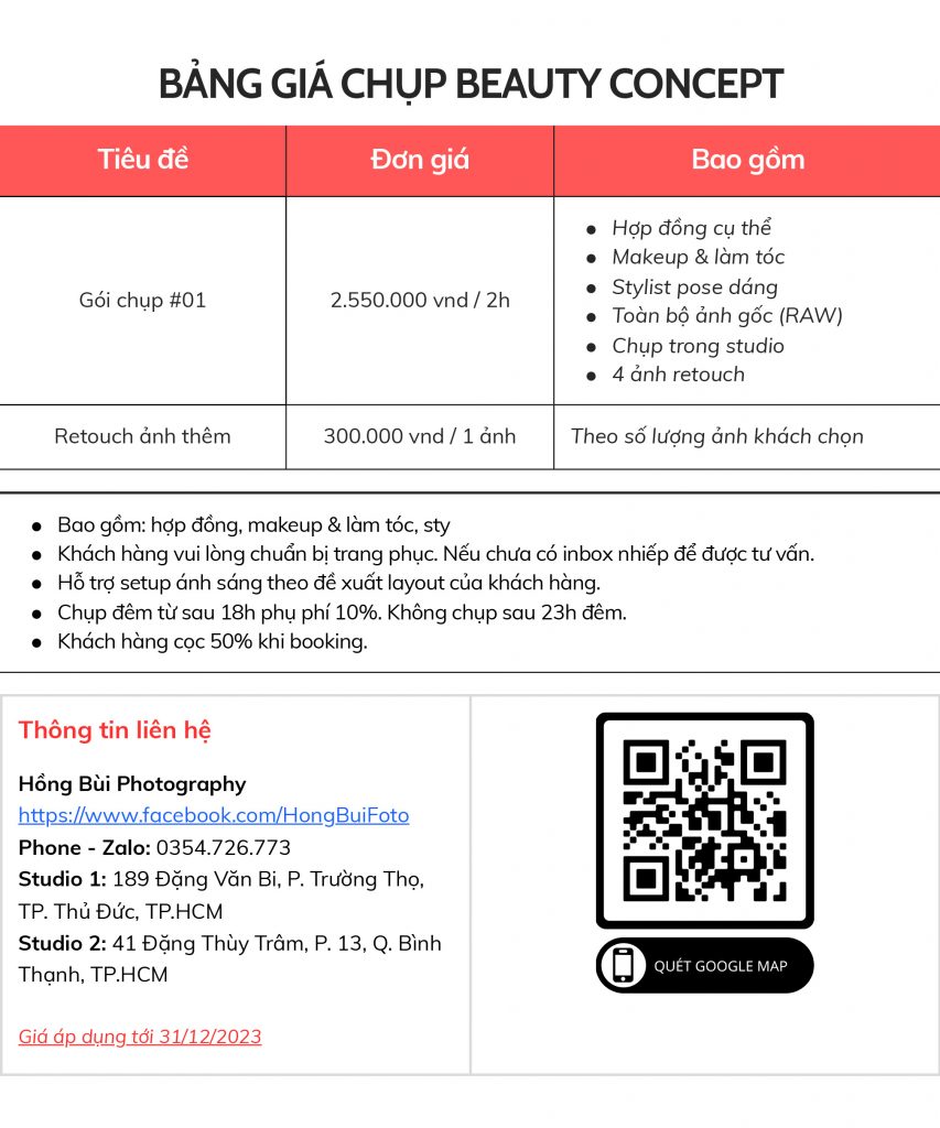 Bảng giá được update tháng 11/2023 chưa bao gồm ưu đãi giảm giá. Liên hệ trực tiếp zalo – facebook của nhiếp ảnh gia để được biết giá ưu đãi.