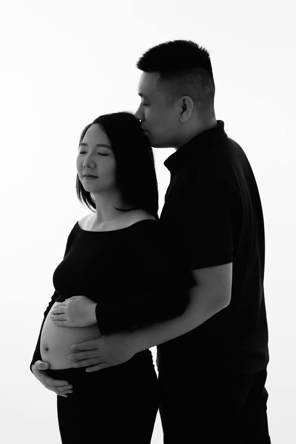 Minimalist Black & White: Sự tối giản tuyệt đối về bối cảnh để tập trung hoàn toàn vào biểu cảm gương mặt và hình khối tròn trịa của bụng bầu.